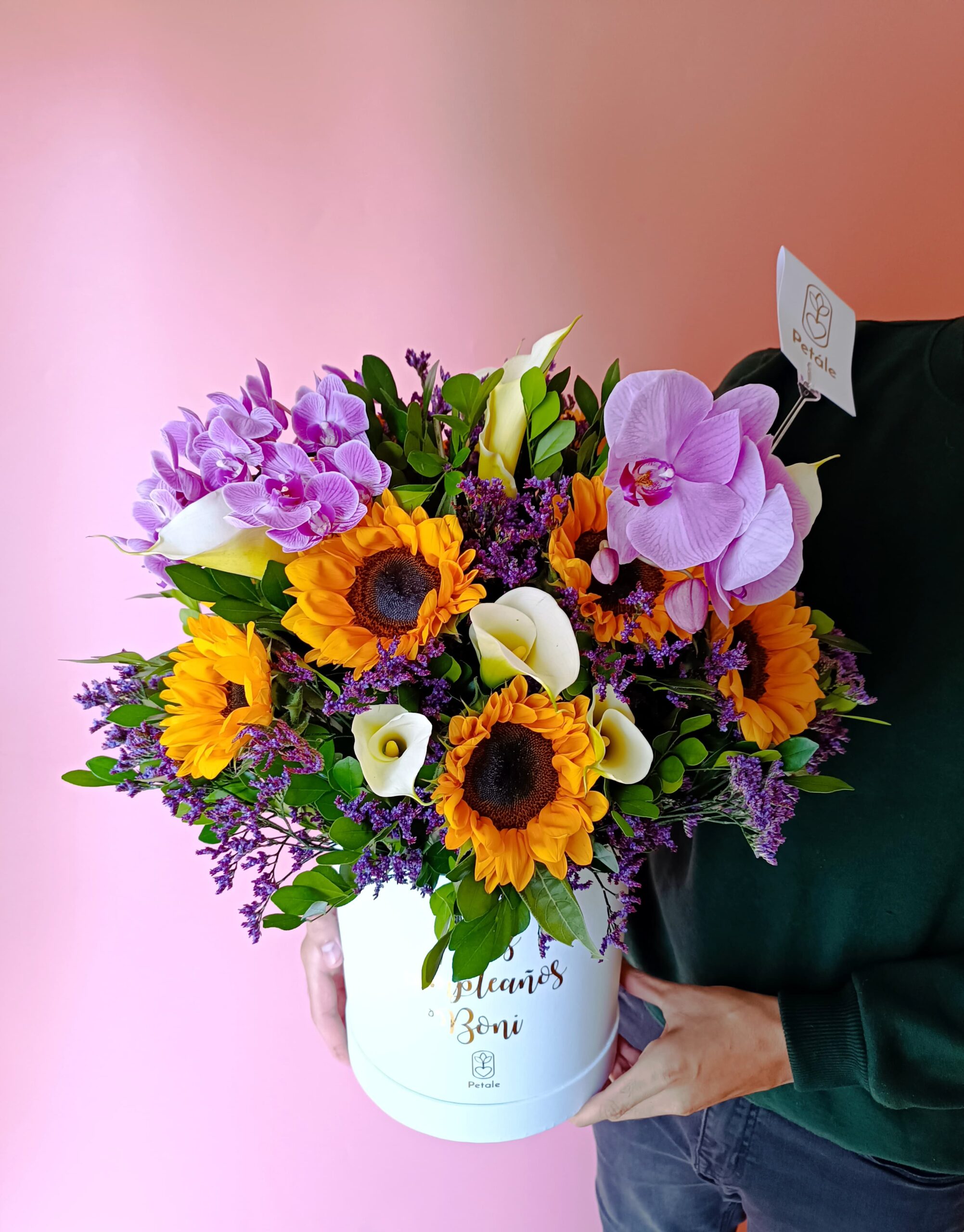 Inclusiones: 10 girasoles premium , mirtos , 10 alcatraces , 2 orquideas , jaspias, tarjeta de dedicatoria , color de box (blanco o negro a elección), dimensiones del box 20 cm x 20 cm, imagen referencial.